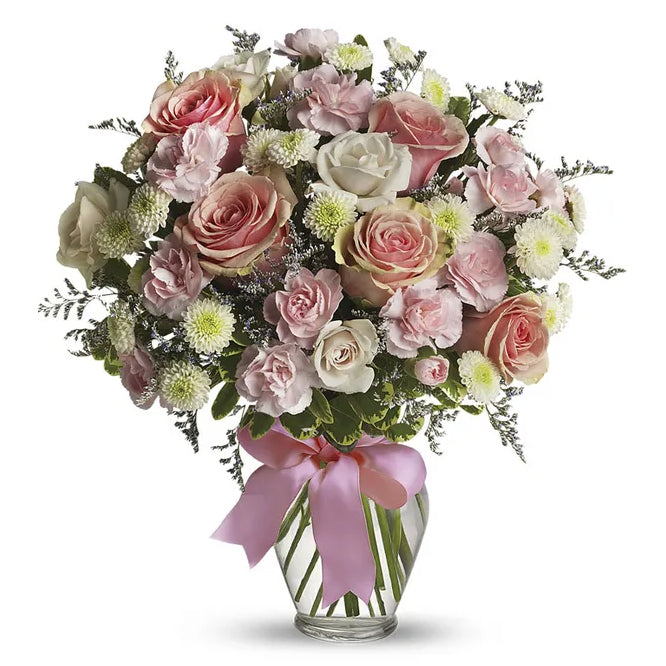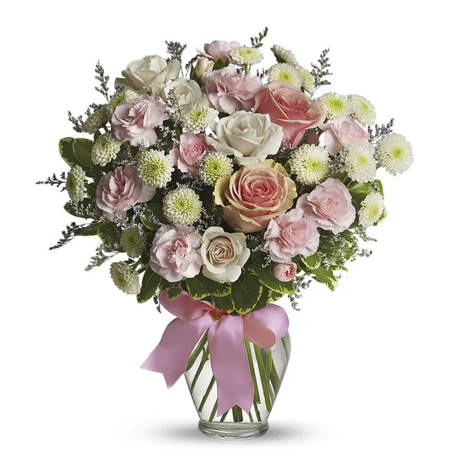 Sweet as candy! This soft pink and white bouquet is a feminine choice for any occasion. A mix of pink and white flowers including roses, miniature carnations and button spray chrysanthemums is delivered in a spring garden vase adorned with pink ribbon. Orientation: All-Around